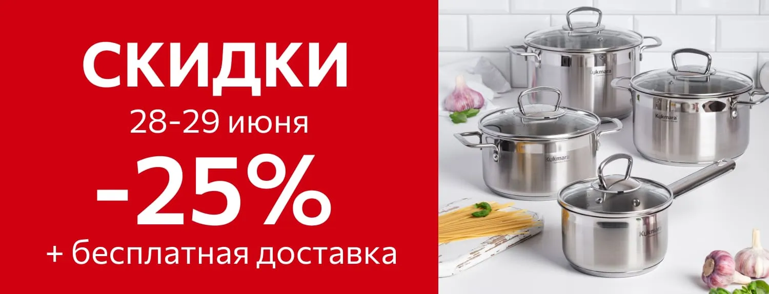 - 25% на посуду из нержавеющей стали коллекции «Safia», «Leon», «Orion», «HoReCa», мантоварки, миски, чайники, столовые приборы, а также кухонные принадлежности.